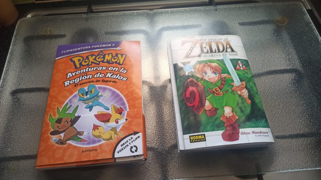 Los libros de Pokémon, se los compramos, y los devoró en menos de un mes. El de color naranja además, dispone de dos historias diferentes.