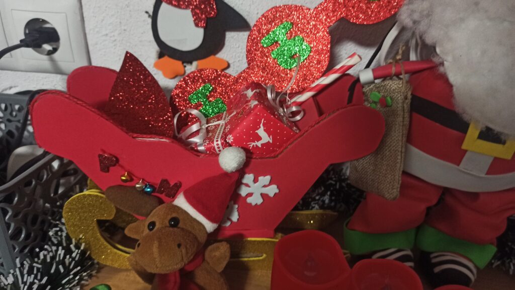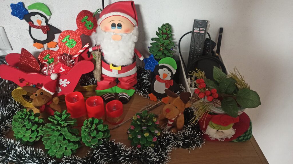 Papá Noel fofucho, con los pingüinos, y el trineo. Luego lo adorno con piñas naturales que cojo del campo y las pintan los niños.
